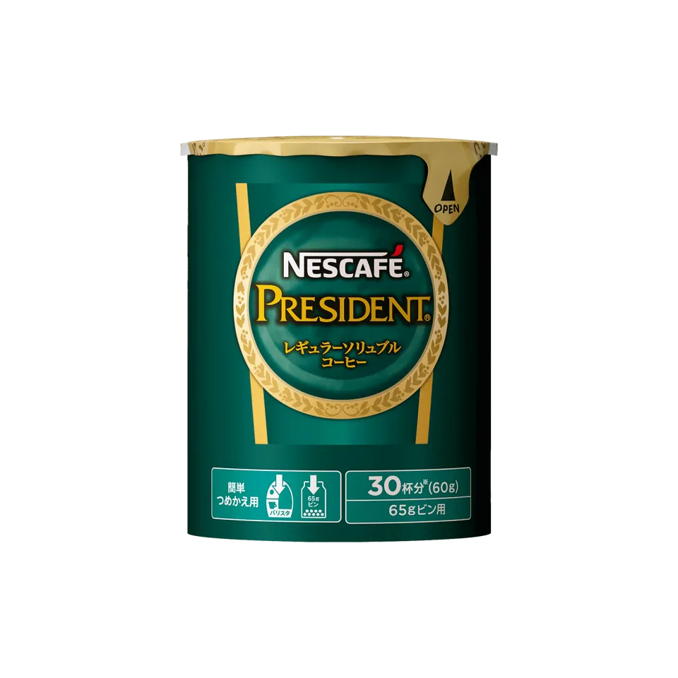 「ネスカフェ プレジデント」は、微粉砕した焙煎コーヒー豆の粒を包み込む「挽き豆包み製法」で、淹れたての豊かな香りとコーヒー本来の味わいを楽しめる「レギュラーソリュブルコーヒー」です。